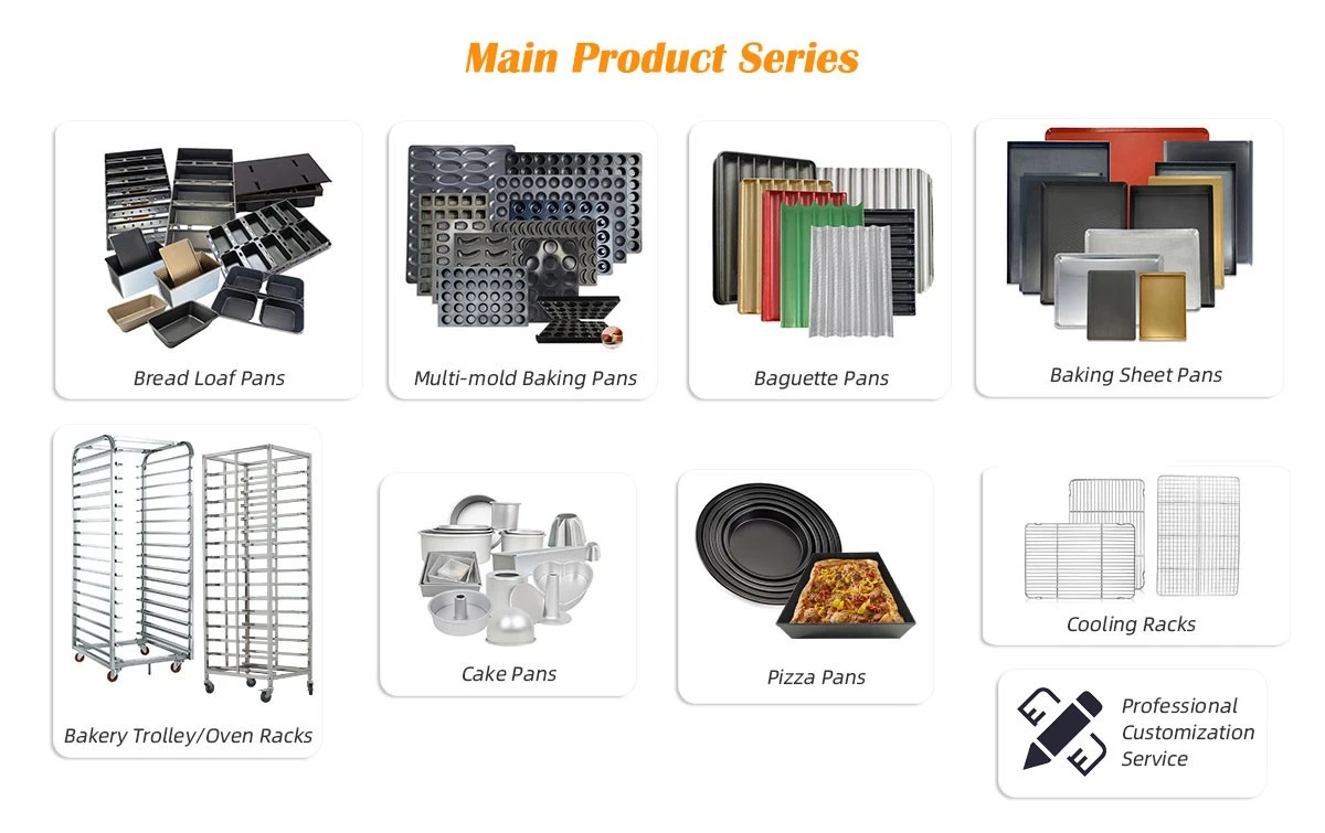 Diseñamos diversos productos de repostería comercial. bandejas y sartenes basado on cliente requisitos — bandejas planas, bandejas para baguette, moldes para pan tostado, moldes para muffins, bandejas para panecillos de hamburguesa, moldes para pizza, moldes para pasteles, bandejas expositoras y más.