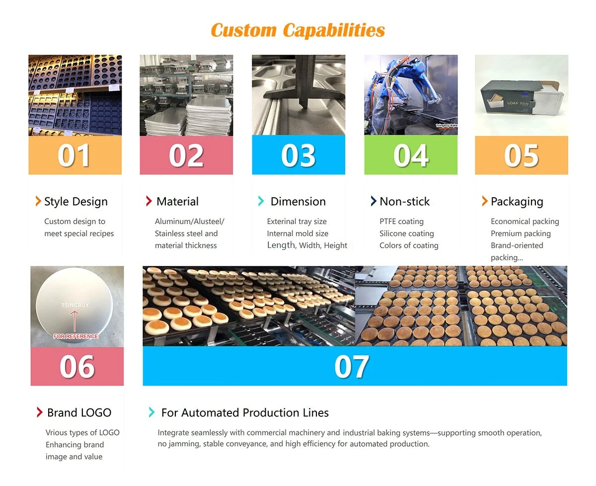 Además de las bandejas y recipientes para hornear estándar para el mercado europeo, americano, australiano y de Medio Oriente, nuestra capacidad más sólida radica en personalización profesional—especialmente para panaderías comerciales medianas y grandes y fabricantes de alimentos industriales. Los moldes para hornear hechos a medida más vendidos incluyen moldes para pan con correas y bandejas para hornear con múltiples moldes adecuadas para muffins, cupcakes, panecillos para hamburguesas, donas, magdalenas y más.