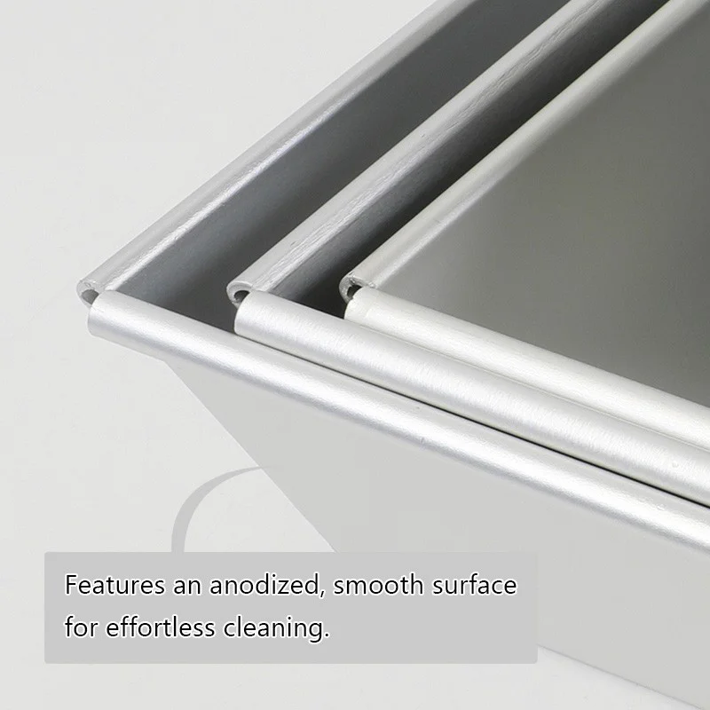 - Anodisé classique : surface durcie et non réactive pour un démoulage naturel et facile des aliments et une durabilité supérieure sans revêtements.